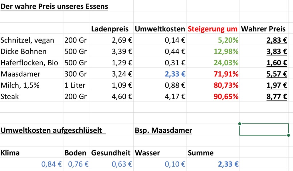 Hier einmal beispielhaft an Hand einiger Lebensmittel aufgeführt, welche steuernde Funktion der „wahre Preis“ haben würde.
