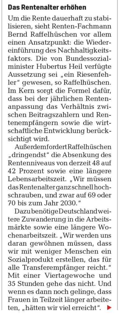 Die Idee, ich habe ja lange genug eingezahlt und jetzt mal ein Recht auf meinen wohlverdienten Ruhestand, steht auf tönernen Füßen. Wenn hier und jetzt und zukünftig nicht ausreichend frisches Geld in die Kassen der beitragsfinanzierten Sozialversicherungen strömen, ist das aus diesen schlichtweg nicht finanzierbar!